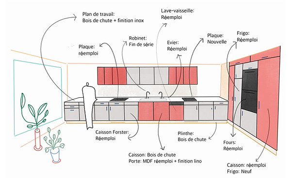 5 kitchennettes et une cuisine collective. La plupart des éléments utilisés pour la fabrication des cuisines ont été récupérés, évitant ainsi de se transformer en déchets. Les achats de nouveaux matériaux ont été réduits au minimum. Tous les éléments récupérés ont été trouvés à moins de 55km de Denens.